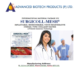 Surgicoll-Mesh is a biocompatible collagen mesh that is flexible, strong yet soft. The collagen membrane is also supple when hydrated and handles like natural tissue. It readily conforms to the surgical site upon application and is easily sutured. Surgicoll-Mesh is constituted by Type-I collagen membrane that is free of contaminants like lipids, elastin and other immunogenic proteins. The collagen used in the Surgicoll-Mesh product is based on a patented technology that ensures the high purity Type-I collagen. It is processed under patented conditions and with stringent USP quality tests as per WHO (World Health Organization) and other international standards.